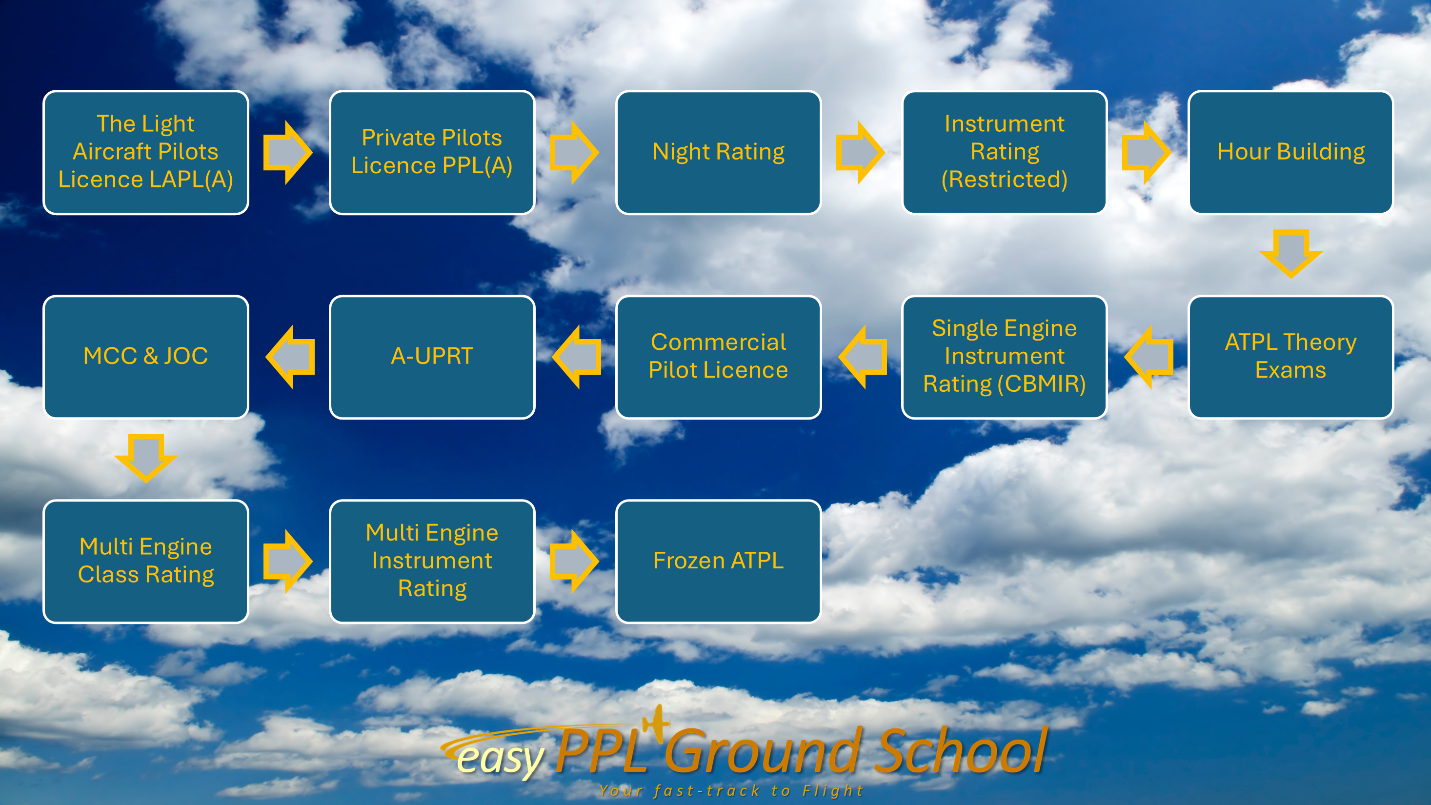 Basically, this route takes you from zero to hearo in a full time manner with an organisation that covers both flight and theory training. Various options might be available including direct entry into a Multi-Pilot Licence (MPL) missing out the more conventional steps that are shown above. The MPL means you won't fly a light aircraft - you're taken straight to flying Commercial Jets. Whilst you might think this has advantages (from your point of view) you'd be surprised the knowledge and fun that you miss out on. In fact some airlines frown on this route since you may not end up with engrained "piloting ability" that comes from learnig and experiencing flight in a light aircraft from an aerodynamic perspective.